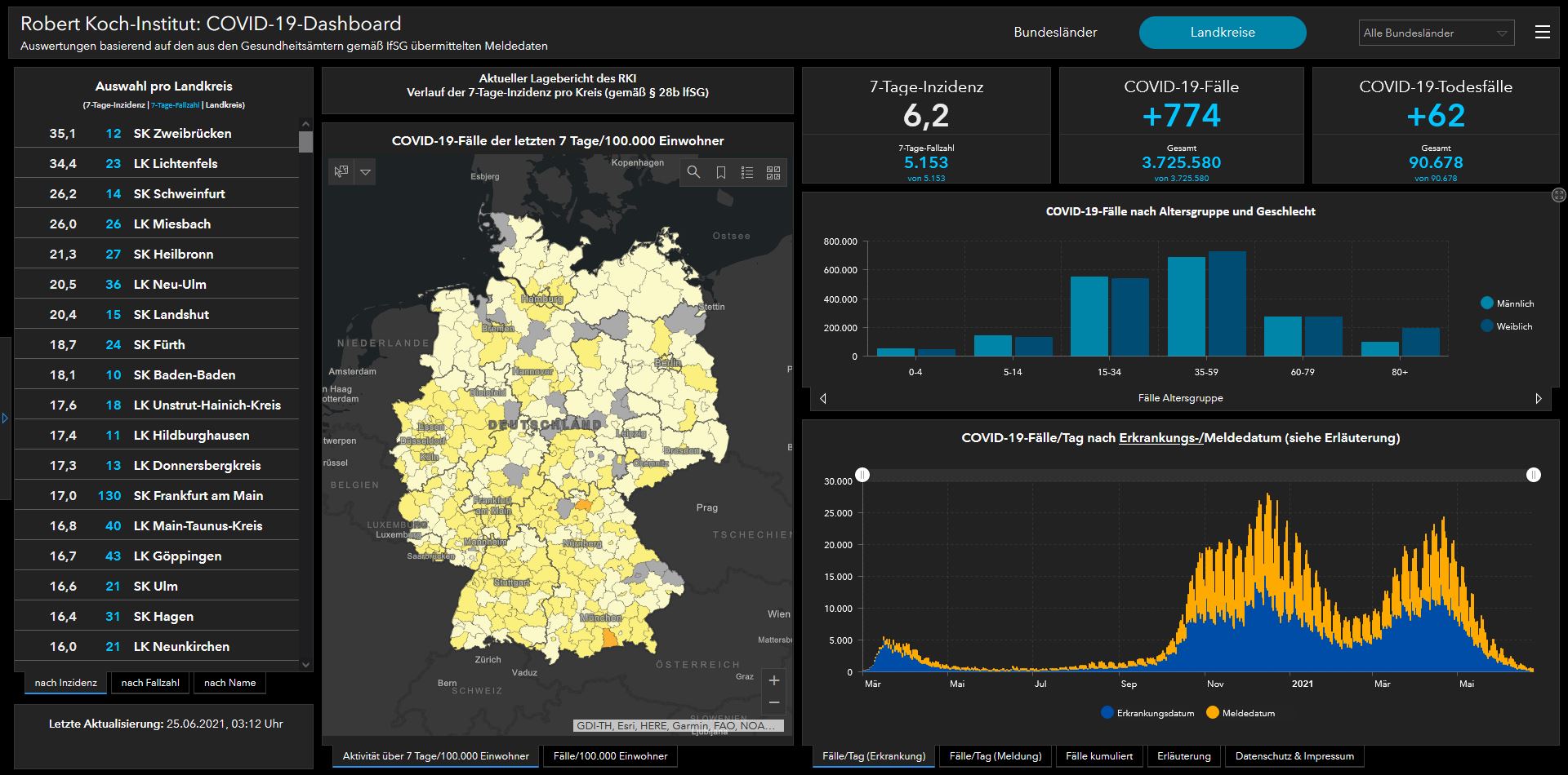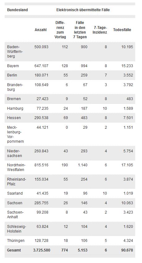 Außerdem stellt das RKI eine Gesamtübersicht der pro Tag ans RKI übermittelten Fälle und Todesfälle sowie die 7-Tage-Inzidenzen auf Kreisebene (gemäß „Bundesnotbremse“) im Excelformat zur Verfügung.