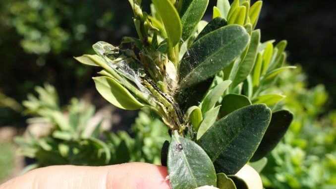 Viele Raupen des Buchsbaumzünslers haben den milden Winter unbeschadet überstanden. Das teilt das Landratsamt Main-Tauber-Kreis mit. Die Schädlinge sind zwischenzeitlich aufgewacht und beginnen an den frühlingswarmen Tagen, die jungen Blätter zu fressen. Im Vergleich zu 2019 scheint der Befall dieses Jahr deutlich stärker zu sein. Die sich aus den jetzigen Raupen entwickelnde erste Generation der Falter schlüpft Ende Mai bis Anfang Juni. Die Falter legen ihre Eier wiederum in den Buchsbaumsträuchern ab.
