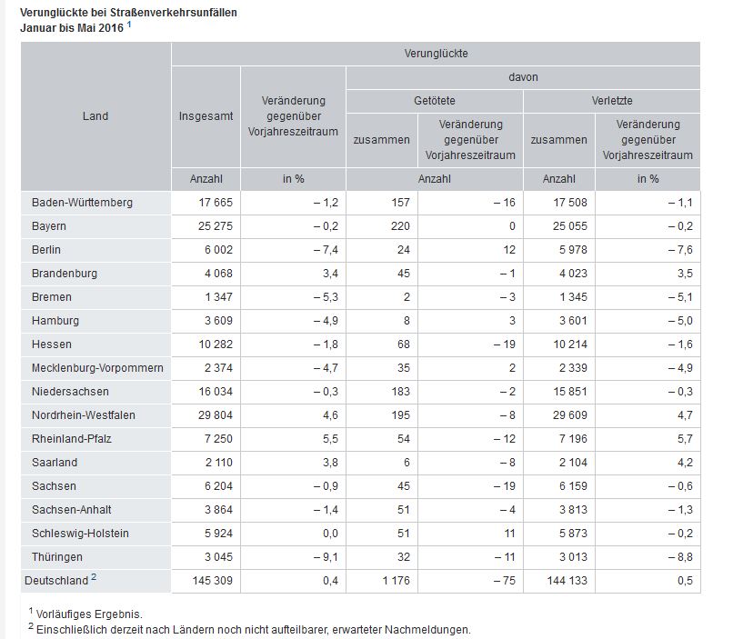 Insgesamt erfasste die Polizei in den ersten fünf Monaten 2016 rund 1,01 Millionen Verkehrsunfälle, das entsprach einer Zunahme um 2,4 % gegenüber Januar bis Mai 2015. Davon waren rund 111 200 Unfälle mit Personenschaden (+ 0,4 %) und 902 800 Unfälle mit ausschließlich Sachschaden (+ 2,7 %).