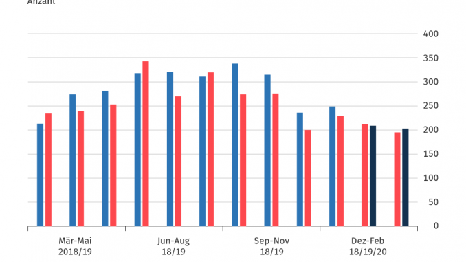 Für den Berichtsmonat Februar 2020 liegen für Rheinland-Pfalz noch keine Ergebnisse vor. Die Daten für Deutschland insgesamt sind eine Schätzung auf Basis der aus den übrigen Bundesländern vorliegenden Ergebnisse. Das endgültige Ergebnis kann daher höhere Revisionen aufweisen als üblich.