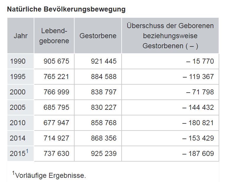 Im Jahr 2015 starben 925 000 Menschen. Gegenüber dem Vorjahr (868 000) ist die Zahl der Sterbefälle um 6,5 % gestiegen. Wie in allen Jahren seit 1972 starben somit mehr Menschen als Kinder geboren wurden. 2015 lag die Differenz bei 188 000, im Jahr 2014 hatte sie 153 000 betragen.