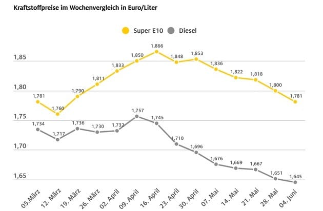Die Kraftstoffpreise an den Tankstellen in Deutschland sinken weiter. Das zeigt sich besonders am Benzinpreis, wie die aktuelle wöchentliche ADAC Auswertung ergibt: Für einen Liter Super E10 müssen die Autofahrerinnen und Autofahrer derzeit im bundesweiten Mittel 1,781 Euro bezahlen und damit 1,9 Cent weniger als in der vergangenen Woche. Deutlich geringer ist der Rückgang des Dieselpreises. Ein Liter kostet aktuell 1,645 Euro, das sind 0,6 Cent weniger als in der Vorwoche. Gleichzeitig rangiert der aktuelle Dieselpreis auf dem niedrigsten Stand seit Juli 2023. Der Abstand zwischen den beiden Sorten hat sich damit wieder verringert.