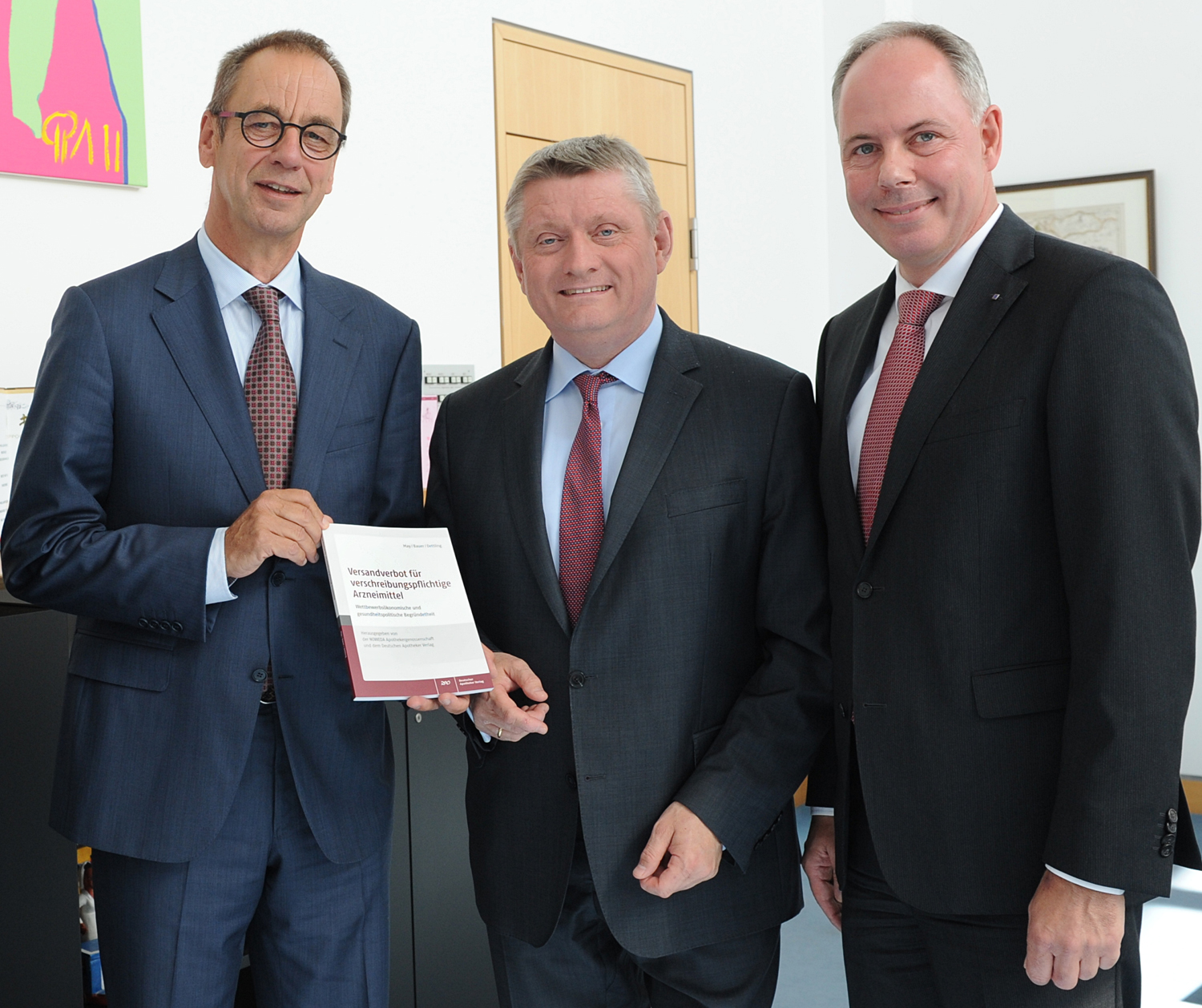 Essen (ots) – Am 4. September 2017 übergaben Dr. Michael P. Kuck, Vorstandsvorsitzender der NOWEDA Apothekergenossenschaft, und Dr. Christian Rotta, Geschäftsführer des Deutschen Apotheker Verlags (DAV), in Berlin das Gutachten „Versandverbot für verschreibungspflichtige Arzneimittel“ an Bundesgesundheitsminister Hermann Gröhe (CDU). Das von Gesundheitsökonom Prof. Dr. Uwe May, Politikwissenschaftlerin Cosima Bauer und Rechtsanwalt Dr. Uwe Dettling erarbeitete Gutachten weist nach, dass nur ein Versandhandelsverbot für verschreibungspflichtige Arzneimittel (Rx) die flächendeckende, wohnortnahe Versorgung sichern kann.