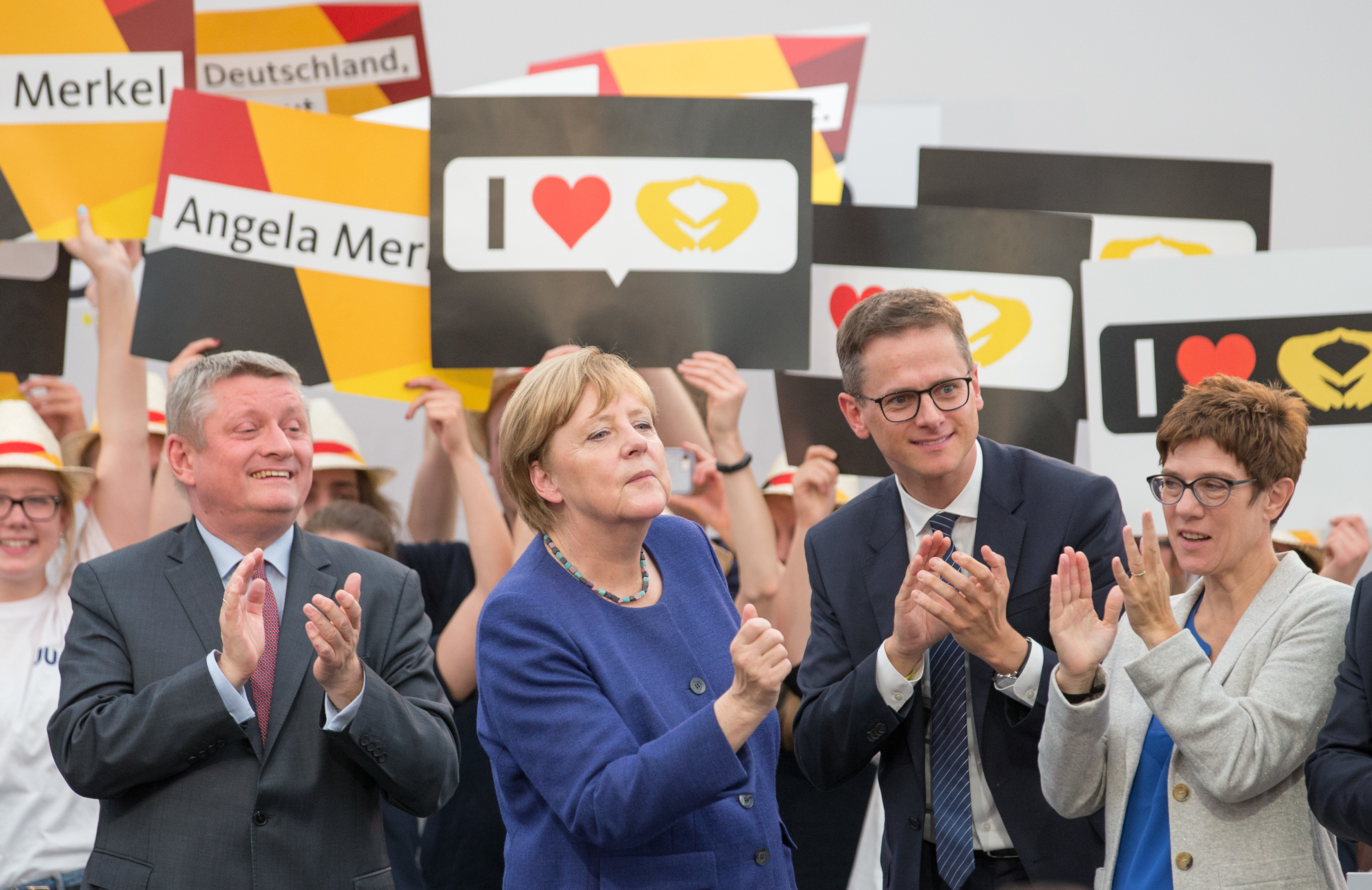 Der Bundesminister für Gesundheit, Hermann Gröhe (l-r), Bundeskanzlerin Angela Merkel, Bundestagskandidat Carsten Linnemann und die Ministerpräsidentin des Saarlandes, Annegret Kramp-Karrenbauer, stehen auf der Bühne am 10.09.2017 in Delbrück (Nordrhein-Westfalen) bei einer CDU-Wahlkampfveranstaltung zur Bundestagswahl. Foto: Friso …