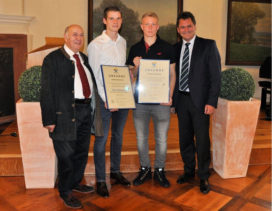 Foto der Sportlerehrung 2015: Geehrt wurden auch Mario Hildenbrand (2.v.l.), Schiedsrichter des SV Nassig und Philipp Ochs (2.v.r.), Fußballprofi, u.a. bei TSG 1899 Hoffenheim. Es gratulierten Manfred Joachim (l.), ehmaliger Vorsitzender Sportkreis TBB sowie Bürgermeister Wolfgang Stein. Foto: Stadt Wertheim