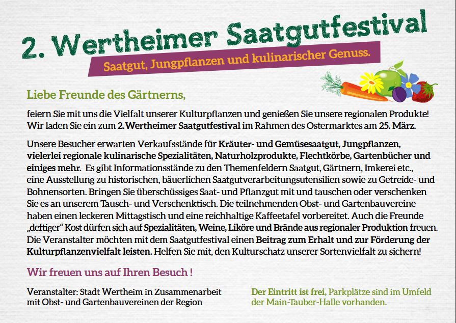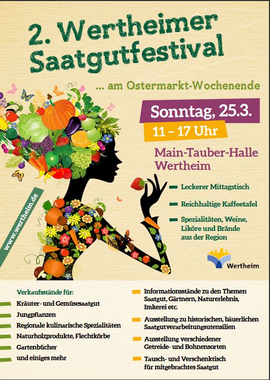 Im Rahmen des Ostermarktes findet am Sonntag, 25. März, in der Main-Tauber-Halle das 2. Wertheimer Saatgutfestival statt. Organisiert wird es von der Stadt Wertheim in Zusammenarbeit mit Obst- und Gartenbauvereinen aus der Region und weiteren lokalen Akteuren.