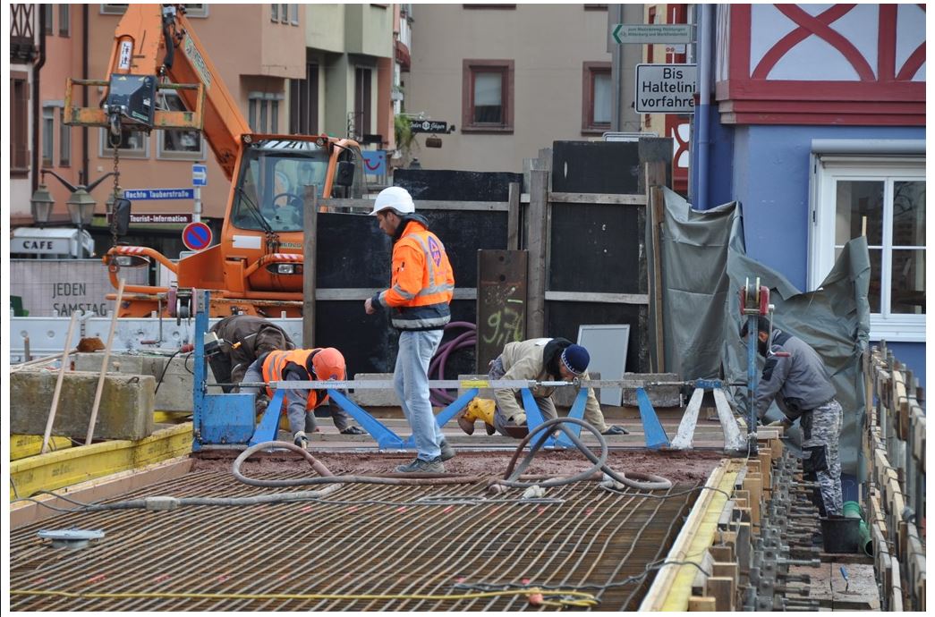 Derzeit sind die Mitarbeiter der Baufirma Adam Hörnig damit beschäftigt, die so genannten Brückenkappen zu betonieren. Der Fußweg über die Brücke rechts und links von der Fahrbahn wird in einem Rotton eingefärbt. Am Fußgängersteg, der auf der linken Tauberseite unter der Brücke hindurchführt, sind die Betonarbeiten ebenfalls im Gang. Der Steg wird in einem dunklen Grauton gehalten. Die Farbgebung folgt damit der Festlegung, die eine Arbeitsgruppe aus Mitarbeitern der Verwaltung und Vertretern des Gemeinderats bei einem Bemusterungstermin im Juli festgelegt hat.