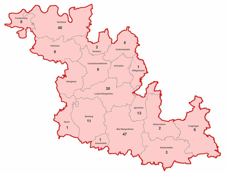 Die Zahl der Genesenen steigt um 51 Personen auf 5435. Somit sind derzeit 180 Personen im Landkreis aktiv von einer nachgewiesenen Infektion betroffen. Sie verteilen sich auf das Gebiet der Kommunen Ahorn: 3 (+2), Assamstadt: 2 (+1), Bad Mergentheim: 59 (+7), Boxberg: 4 (+1), Creglingen: 5, Freudenberg: 12 (+1), Großrinderfeld: 0, Grünsfeld: 0, Igersheim: 6 (+1), Königheim: 1, Külsheim: 5 (+1), Lauda-Königshofen: 16 (+1), Niederstetten: 0, Tauberbischofsheim: 13 (+2), Weikersheim: 2, Werbach: 0, Wertheim: 51 (+19) und Wittighausen: 1.