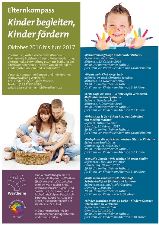 Die Elternkompassreihe 2016/17 wird wieder mit einem Plakat beworben, das über alle Termine und Veranstaltungen informiert. Zusätzlich gibt es Flyer im handlichen Din-A-5-Format zu jeder Einzelveranstaltung. Diese Flyer werden über die Wertheimer Kindertagesstätten und die Elternbeiräte der Schulen verteilt.