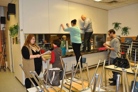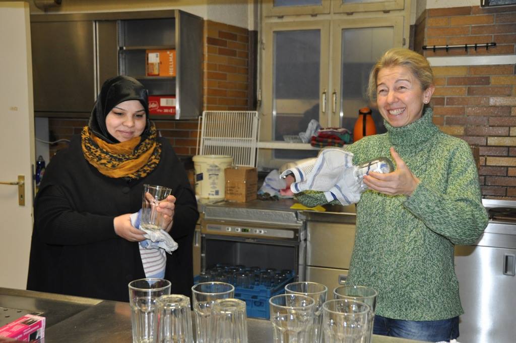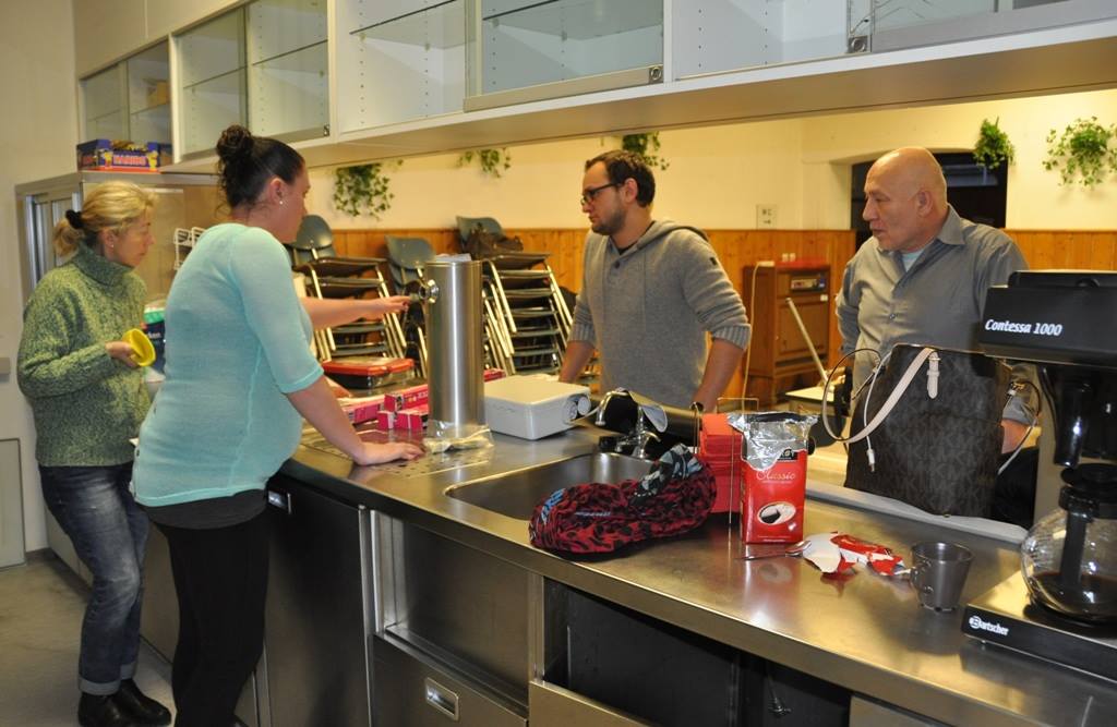 Arbeitseinsatz nach Feierabend: Eine fleißige Truppe von „Willkommen in Wertheim“ traf sich heute Abend, um das Begegnungscafé im Stadtteil Reinhardshof für die Eröffnung am Freitag herzurichten. Noch zweimal schlafen, dann startet die Nutzung der ehemaligen Polizeikantine als Begegnungsmöglichkeit für Flüchtlinge und Einheimische. Jeden Dienstag und Freitag wird von 14 bis 17 Uhr geöffnet sein.