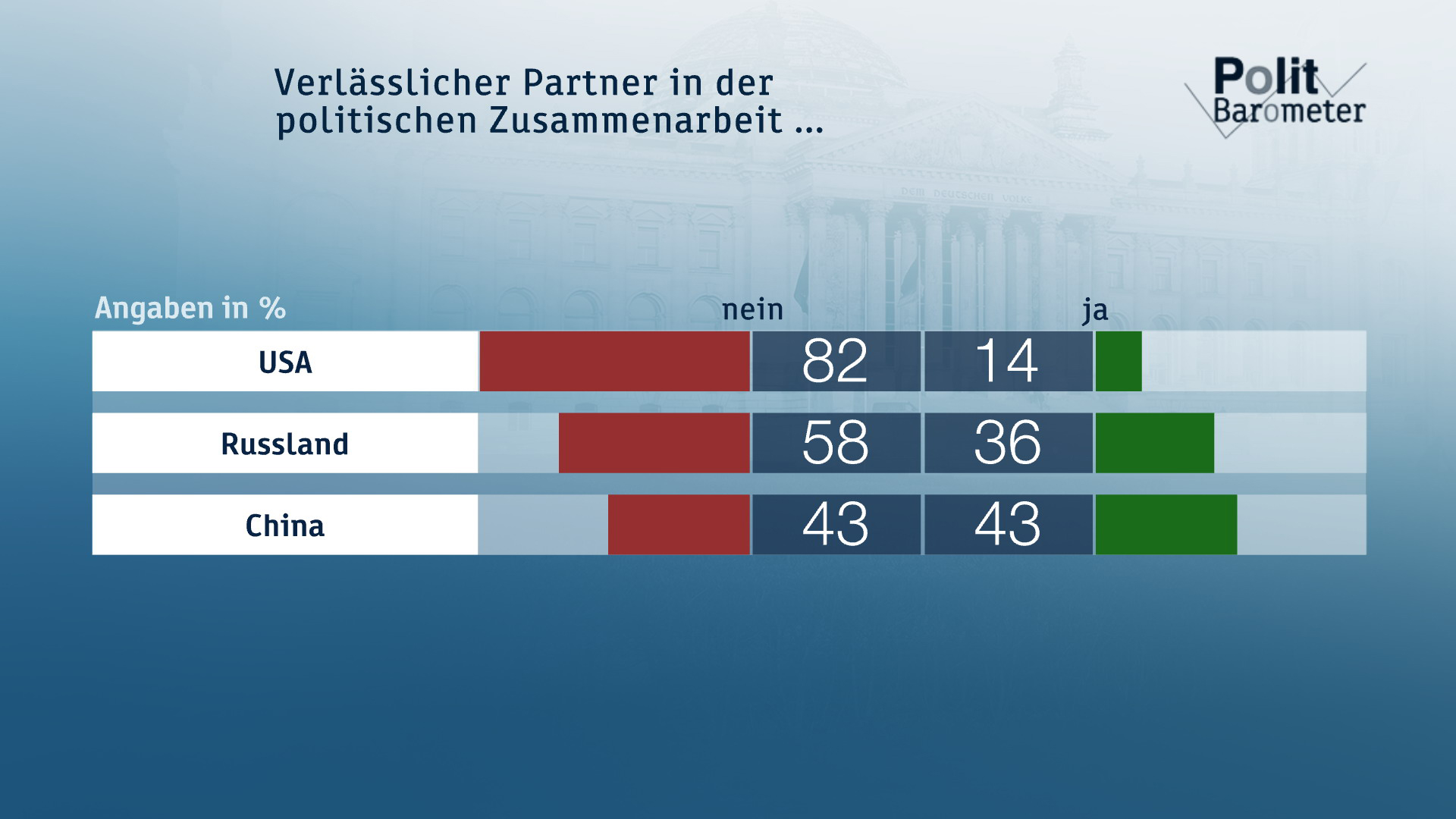 Mainz (ots) – Für 82 Prozent der Befragten, darunter Mehrheiten in allen Parteianhängergruppen, sind die USA für Deutschland kein verlässlicher Partner, wenn es um die politische Zusammenarbeit geht. Nur 14 Prozent halten die USA für verlässlich (Rest zu 100 Prozent hier und im Folgenden jeweils „weiß nicht“). Wie immens dieses Vertrauensdefizit ist, zeigt sich beim Vergleich mit Russland und China. So sehen 36 Prozent in Russland einen verlässlichen Partner, für 58 Prozent ist Russland das nicht. Dabei schätzen die meisten Anhänger der AfD (61 Prozent) Russland als vertrauenswürdig ein, die Anhänger der Linken sind gespalten (ja: 45 Prozent; nein: 49 Prozent) und die Anhänger von CDU/CSU (61 Prozent), SPD (65 Prozent), FDP (58 Prozent) und Grünen (74 Prozent) bezweifeln dies mehrheitlich. Im Fall von China gehen die Meinungen auseinander, für 43 Prozent ist China ein zuverlässiger Partner, ebenso viele (43 Prozent) glauben das nicht. Neben 59 Prozent der AfD-Anhänger bezeichnen auch 49 Prozent der Linke-Anhänger China als verlässlich.