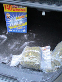 Waschmittelverpackung und Beutel mit Marihuana im Kofferraum des Schmuggelfahrzeugs